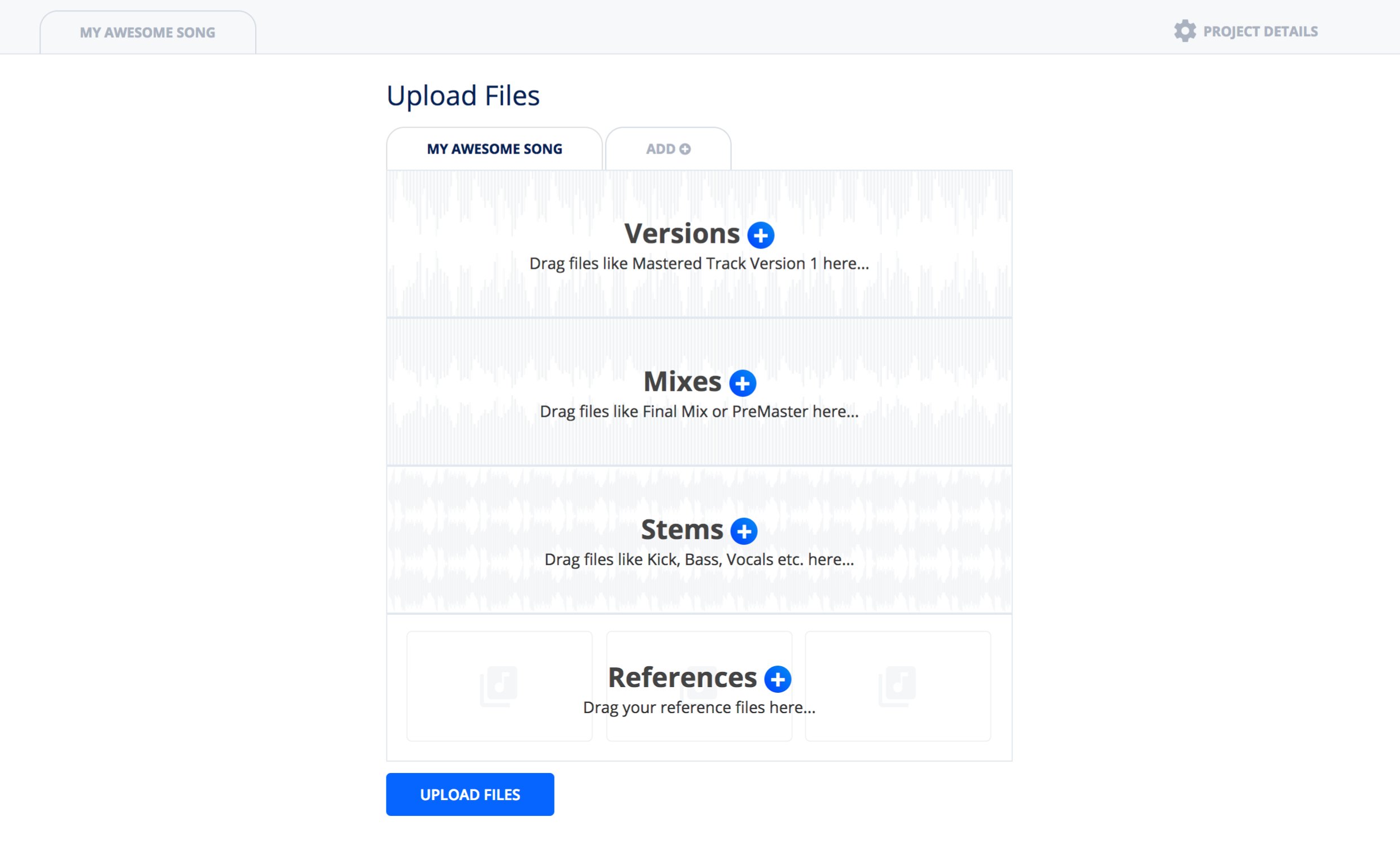 Bounce Boss helps you keep ALL your project files in one place. You and your collaborators can upload new masters, mixes, stems, and references to a project. Click the ‘Upload Files’ button located above the waveform, drag your files into the box that best describes them (master, mix, stem, or reference) click upload, and Bounce Boss does the rest. Your files will be organized within the project and your collaborators will be notified that new audio files have been added.