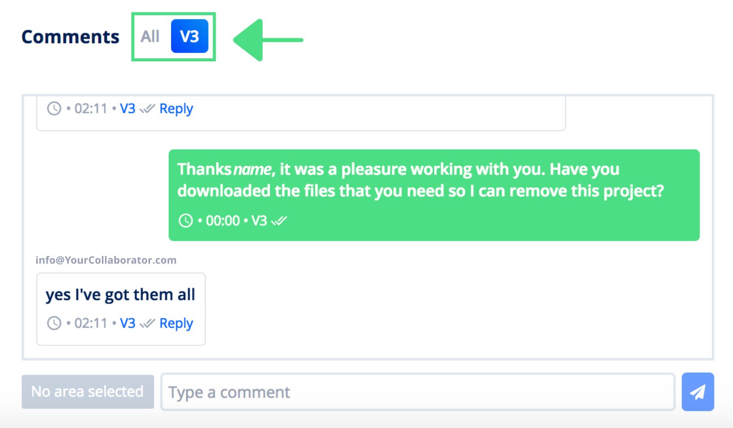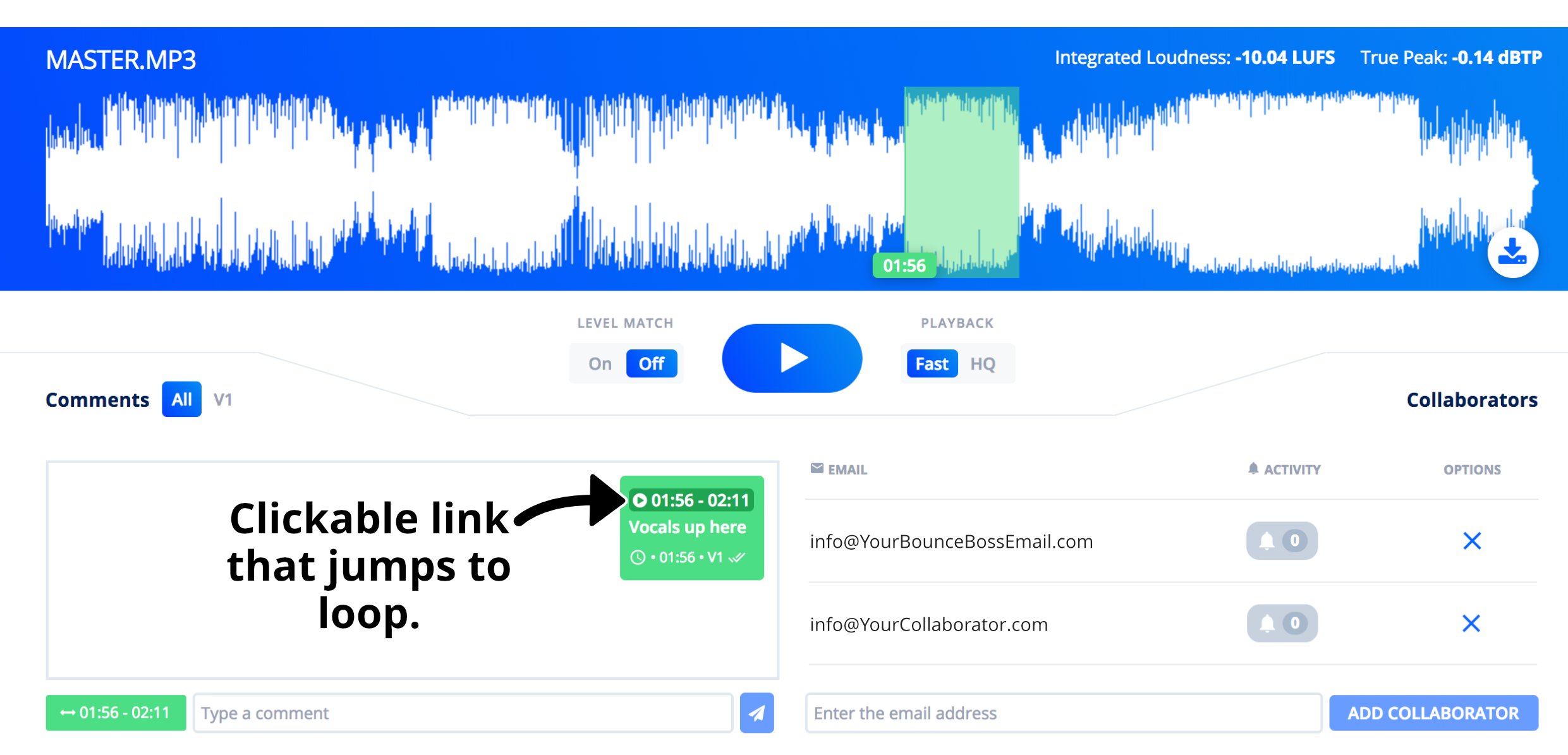 Loops can also be used to specify what a comment relates to. Create your loop, add a comment in the real-time chat window like “Vocals up here” . Your collaborators will see a link in your comment which will allow them to immediately jump to that loop. This minimizes any confusion and dramatically speeds up the producer’s workflow. Pro Tip: The real-time chat window is pretty smart… You can type times like 01:30 or an area like 01:45-02:15 in your comment and these will become playback links in your posted comment.