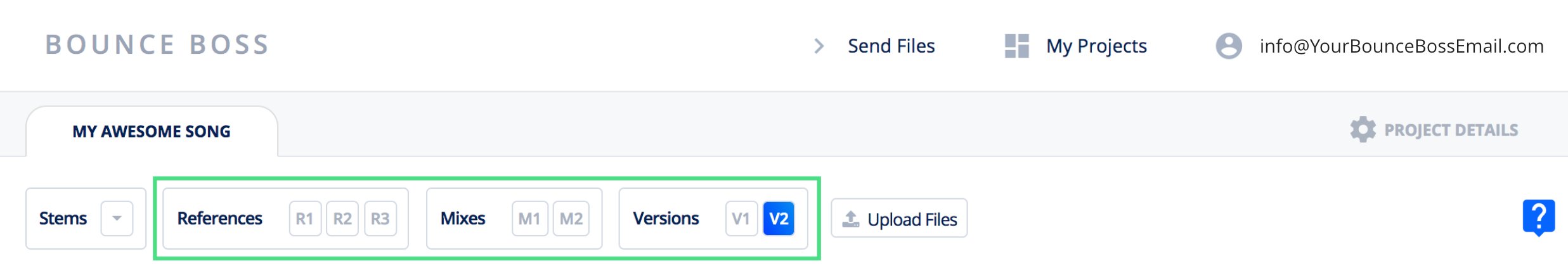 Pro Tip: You can click on the buttons or use the keyboard shortcuts S, R, M, V (stems, references, mixes, masters) together with the number keys 1-9 to navigate these items quickly.