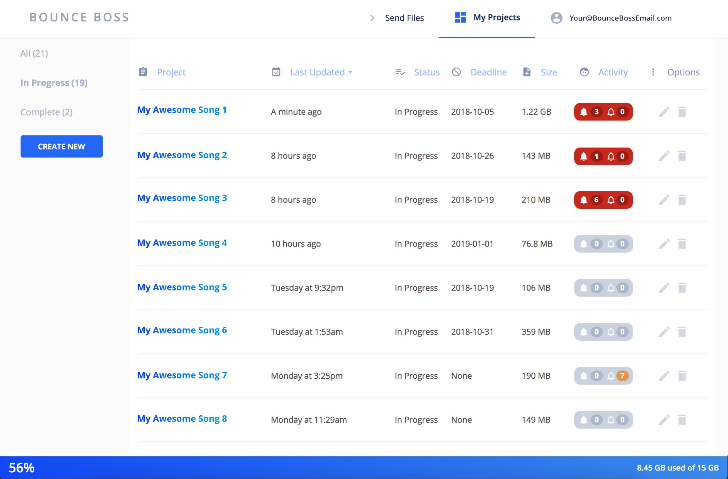 Bounce Boss sends you smart emails. You won’t get hundreds of emails every time a comment is added to a project. You’ll get one email to notify you when new comments are added since your last visit to that project. You’ll get an additional email if your collaborator uploads new tracks. If you’re live chatting using the comments box in the project and you’ve seen the updates then Bounce Boss won’t send you an unnecessary notification email.