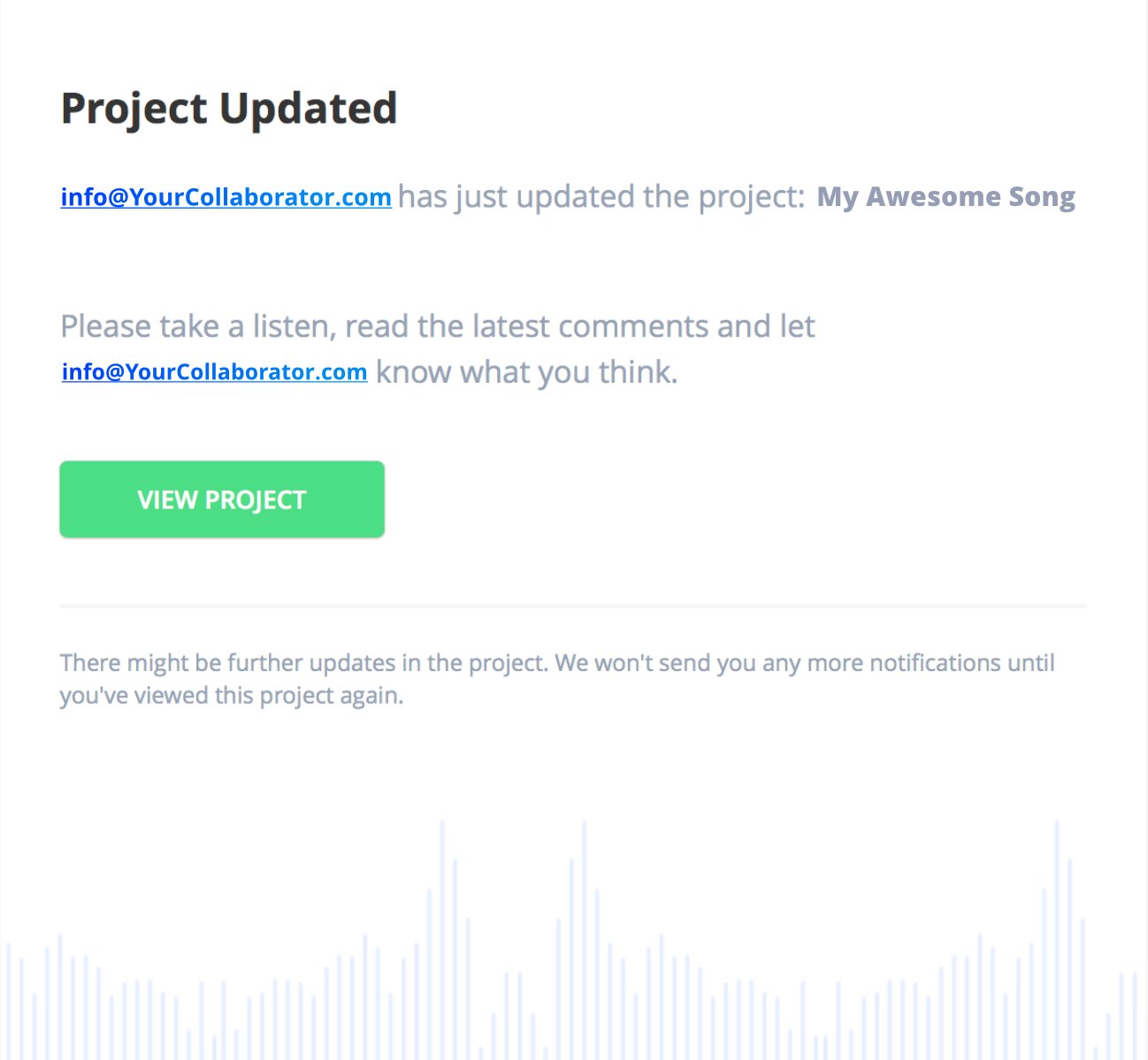 Sending files only takes a minute. From this one simple step, Bounce Boss organizes and creates your project, then notifies your collaborator with a professional invitation to collaborate. Your collaborator will even see a waveform visual of the file you uploaded in the email itself!