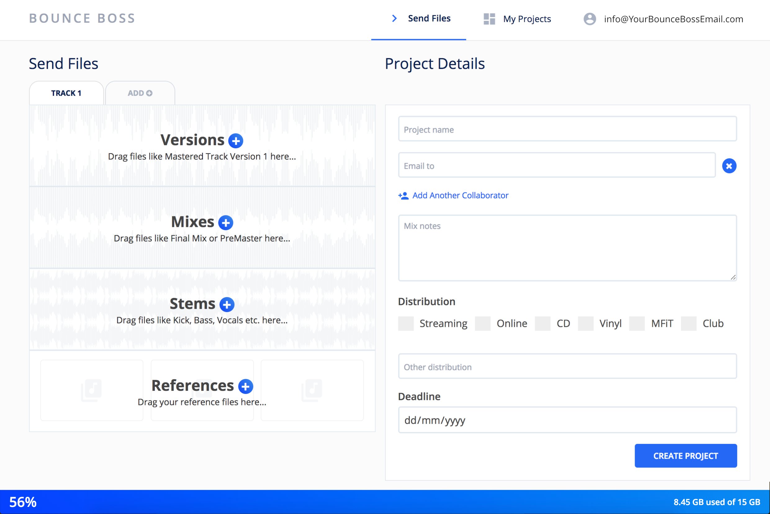 Even the most complicated projects become perfectly organized and easy to handle with Bounce Boss. The ‘Create Project’ page allows you to create the different tracks in the project and upload masters, mixes, stems, and references that relate specifically to each track. You can also fill in all the necessary details for a successful project such as mix notes, distribution and deadline.